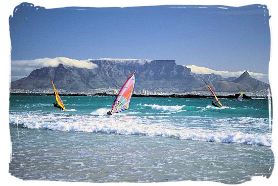 View of Table Mountain from Blouberg beach with Devil's Peak left and Lion's Head right